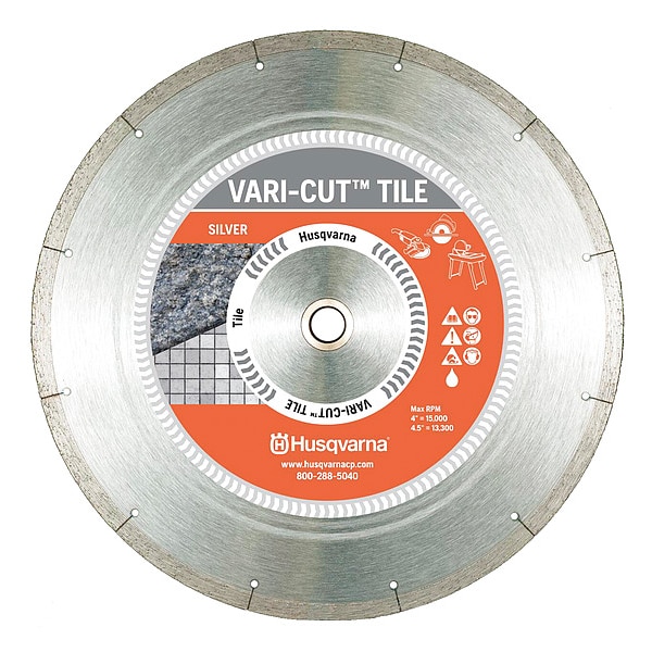 Diamond Saw Blade, Vari-Cut Tile Series, Blade Dia. 4 in, Arbor Size 5/8 in, 7/8 in, Arbor Shape Round, Max. Blade Speed 15,000 RPM, Max. Saw Power 3 hp, For Use With Saw Type Angle Grinders, Circular Saws, Tile Saws, Cutting Type Wet, Rim Type Continuous, Max. Cutting Depth 1 in, Materials Cut Tile, Grade Better, Cut Width 0.06 in, Blade Material Diamond