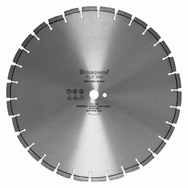 Diamond Saw Blade, FLX280 Series, Blade Dia. 18 in, Arbor Size 1 in, Arbor Shape Round, Max. Blade Speed 3,395 RPM, Max. Saw Power 50 hp, For Use With Saw Type Large Flat Saws, Small Flat Saws, Cutting Type Wet, Rim Type Segmented, Max. Cutting Depth 6 5/8 in, Materials Cut Asphalt, For Use On Concrete Type Asphalt, Grade Good, Cut Width 0.13 in, Blade Material Diamond