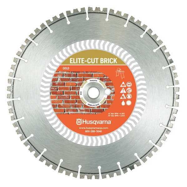 Diamond Saw Blade, Elite-Cut Brick Series, Blade Dia. 14 in, Arbor Size 1 in, Arbor Shape Round, Max. Blade Speed 5,460 RPM, Max. Saw Power 20 hp, For Use With Saw Type Power Cutters, Small Flat Saws, Cutting Type Wet/Dry, Rim Type Segmented, Max. Cutting Depth 5 in, Materials Cut Brick Pavers, Dense Concrete Pavers, General Purpose Brick, Stone, Grade Better, Cut Width 0.13 in, Blade Material Diamond