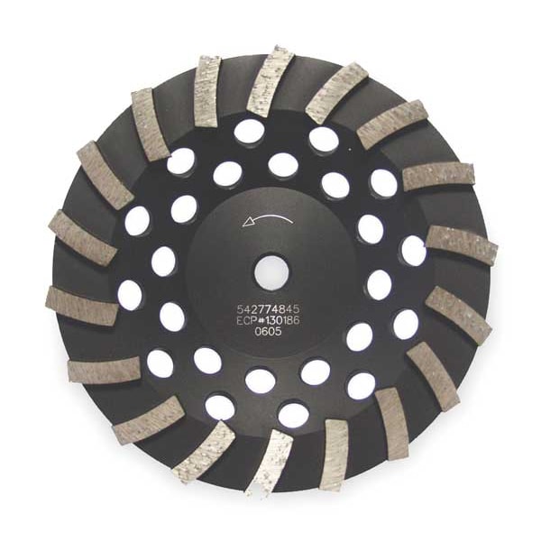 Segment Cup Grinding Wheel, Abrasive Material Diamond, Connector Size 5/8 In.-11, Connector Type Threaded Hole, Compatible Tool Type Angle Grinder, Primary Material Application Concrete, Number of Segments 18, Overall Diameter 7 in, Segment Design Turbo, Maximum Operating Speed 8,600 RPM, Series Vari-Grind G50, Abrasive Depth 3/16 in