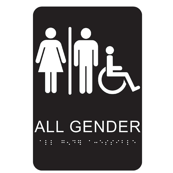 HYKO BrailleTactile Sign, Rectangular, Language English, Legend ALL GENDER, Legend Color White, Background Color Black, Plastic, Dimensions 9 in H x 6 in W