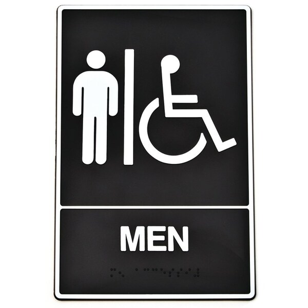 Braille 2 raised lettering and graphics meet ADA requirements. Made of heavy-duty plastic with contrasting eggshell finish and self-adhesive tabs. Packaged for the customer to feel the contour of the sign. Sign shows handicap symbol and states MEN''.''