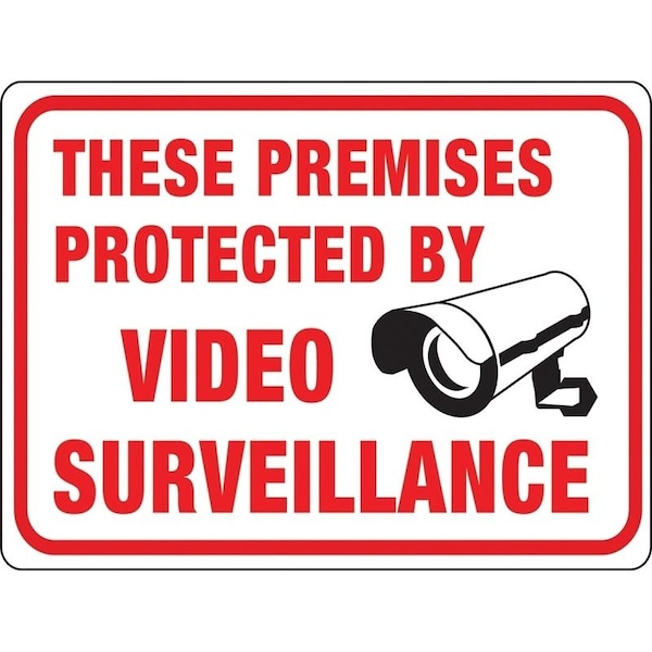 Weather-resistant, durable, bright polystyrene sign with attention-getting red lettering on a white background. Sign states THESE PREMISES PROTECTED BY VIDEO SURVEILLANCE'' with a black symbol.''