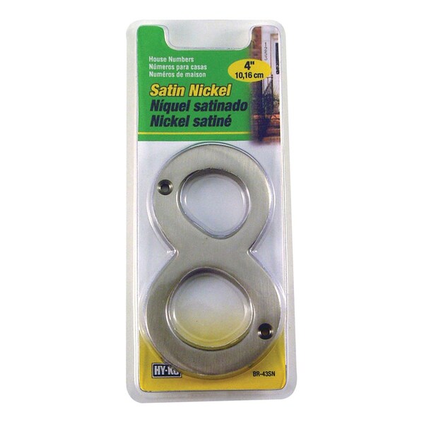 Add an elegant accent to your home with this 4 inch high-quality dimensional satin nickel house number 8. Can be used with Hy-Ko Prestige series address plaques or mounted directly to the home. Includes mounting hardware for quick and easy installation.