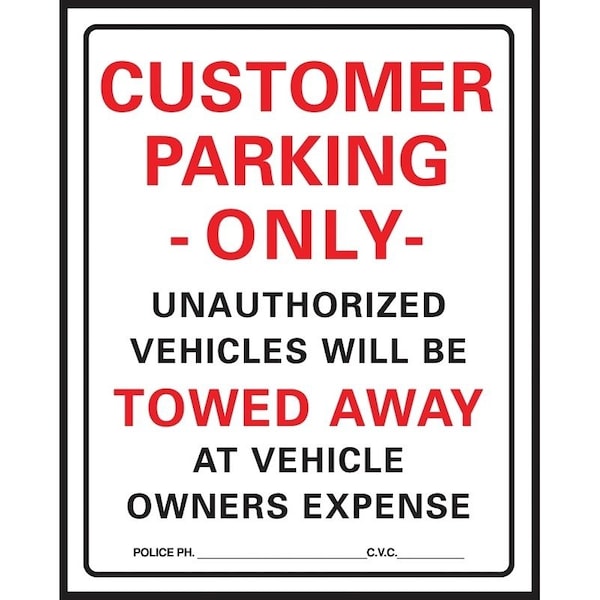 Red and black letters on white background Sign states CUSTOMER PARKING UNAUTHORIZED VEHICLES WILL BE TOWED AWAY AT VEHICLE OWNERS EXPENSE