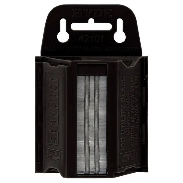 Dispenser holds 100 heavy-duty utility blades. One blade dispensed at a time. Designed to be wall hung or fit easily into a tool box.