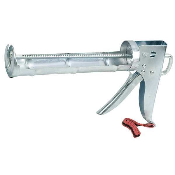Caulk Gun, Thrust Ratio 6:1, For Container Size 10 oz, Barrel Materials Steel, Frame Style Half Barrel, Grip Style Standard, Material Metal, Plunger Type Ratchet Rod, Product Type Caulk Gun, Color Silver, For Container Type Cartridge