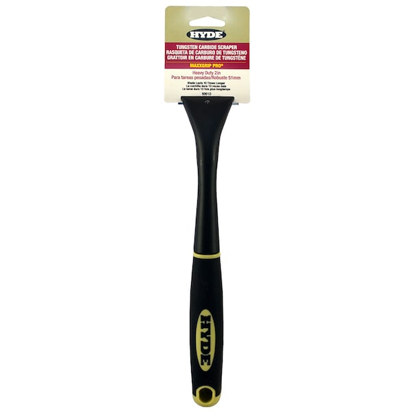 2" tungsten carbide blade lasts 10 times longer than carbon steel. Two scraping edges. Cast metal shaft and blade holder. Contoured polypropylene grip with hang hole.