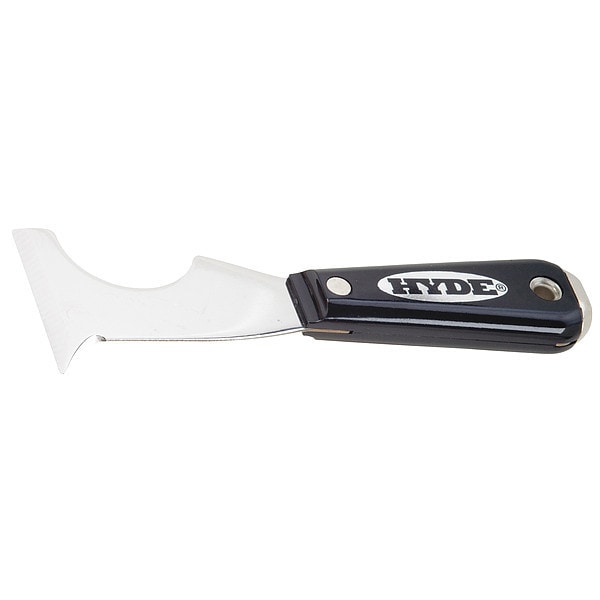 This Hyde 01870 2 1/2" Carbon Steel Painters Tool is the perfect tool for scraping paint, putty and other materials off surfaces. The blade is 6-in-1, full tang stainless steel that can be used as a putty knife or scraper. The stiff blade allows you to apply pressure evenly when removing paint and other materials from surfaces. It has an overall length of 7 5/16 in., with a 3 1/2 in. blade length and 2 1/2" blade width. The handle is made of nylon with a 4 in. tapered design for added comfort while working. For your next painting project, rely on this Hyde Painters Tool to get the job done quickly and efficiently.