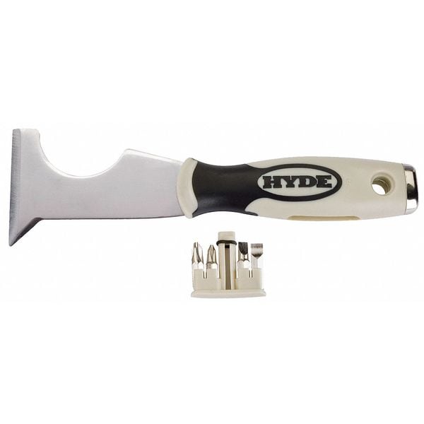 This Hyde 06920 Painters Tool is the perfect tool for applying paint to surfaces. It has a stiff blade that will allow you to work with it more efficiently. The 10-in-1 blade is made of carbon steel and has a width of 2 1/2 in. and length of 3 1/4 in. The soft grip handle offers superior comfort while you are working with this painters tool. Its 5 in. handle makes it easy to hold on to as you work with it, making it an essential addition to your painting supplies. When you need the ability to apply paint quickly and easily, this Hyde 06920 Painters Tool is the ideal choice for the job.