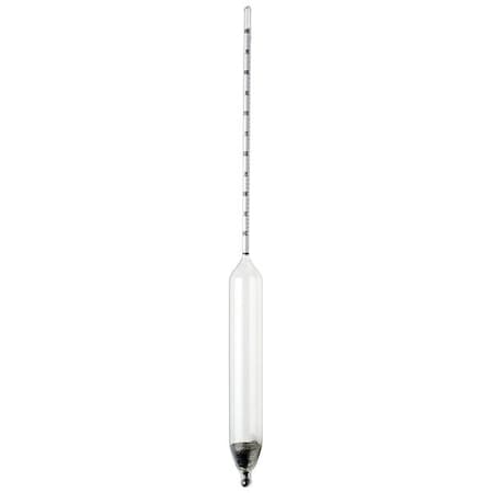 Hydrometers are typically made out of glass or plastic and feature a weighted bulb at one end which is calibrated to sink at a certain rate when placed into a fluid. The bulb is calibrated with markings that indicate the relative density or concentration of the fluid it's placed into.