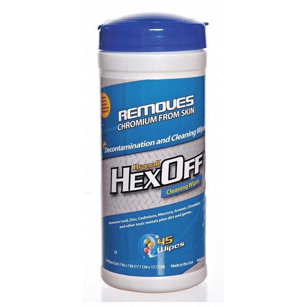 Heavy Metal Removing Wipes, Container Type Canister, Flushable No, Form Wipes, Formula Non Rinse, Fragrance Fresh, Hygiene Properties None, NSF Rating Not Rated, Series Hexoff, Standards Not Applicable, Wipe Length 7 in, Wipe Width 7 in, Wipes per Container 45, Material Fiber Cloth, Product Type Hand and Body Wipes, Color White, Requires Dispenser No, Grainger Dispenser Part Number Not Applicable, Manufacturer Dispenser Part Number Not Applicable, Package Quantity 12