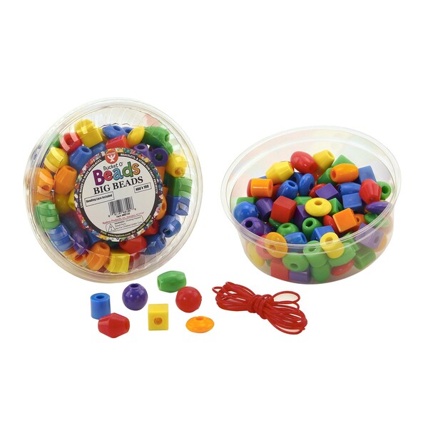Big Beads are sure to keep little ones stimulated and happy. The beads are excellent quality and can be reused over and over. Help children develop fine motor skills, hand-eye coordination, color differentiation, sorting and grouping with these fun and vibrant Big Beads. Preschool teachers enjoy using these beads as a fun and relaxing educational activity. Great for teaching little hands to use hand-eye coordination. The large holes make it easy to thread. They come in bright eye-catching colors. Lacing lanyard included. Beads range in size from 3/4 inch - 1 inch.