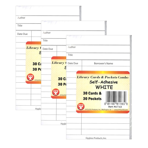 Library Cards + Self-Adhesive Pockets Combo, White, 30 of Each, PK3