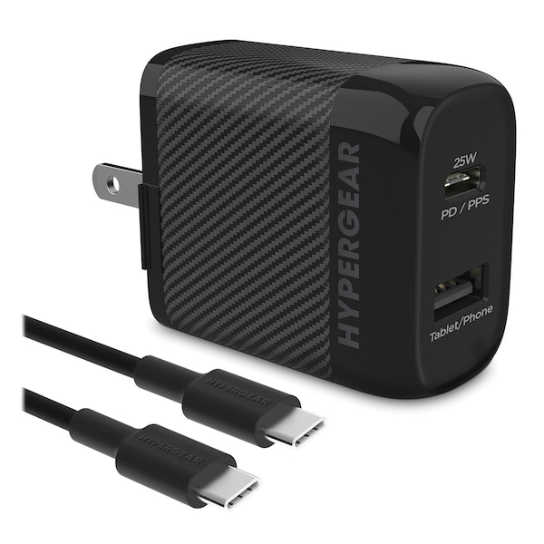 Boost your drive with Power Delivery and PPS efficient fast charging technology! The SpeedBoost Dual-Output USB-C Wall Charger Kit is a complete super-fast charging upgrade package. The charger showcases a 25-watt USB-C PD port with more than 4x the power of standard chargers, capable of taking the newest and biggest Android phones from 0 to 50% in under 30 minutes. And with PPS support for compatible phones, the charger is able to make micro-adjustments throughout the entire super-fast charging cycle that boost its efficiency, charge your phone even faster, and protect your battery from harmful heat buildup. The included 6 ft. USB-C to USB-C cable is rated to carry all that high-speed power to your phone or tablet, and the additional 12-watt USB port is compatible with all charging cables that use a USB-A connector, so you can power up all your daily tech accessories, too: power banks, smartwatches, wireless earbuds, and even video game controllers. Upgrade to cutting-edge charging tech, and feel the speed of a SpeedBoost super-fast charge today!