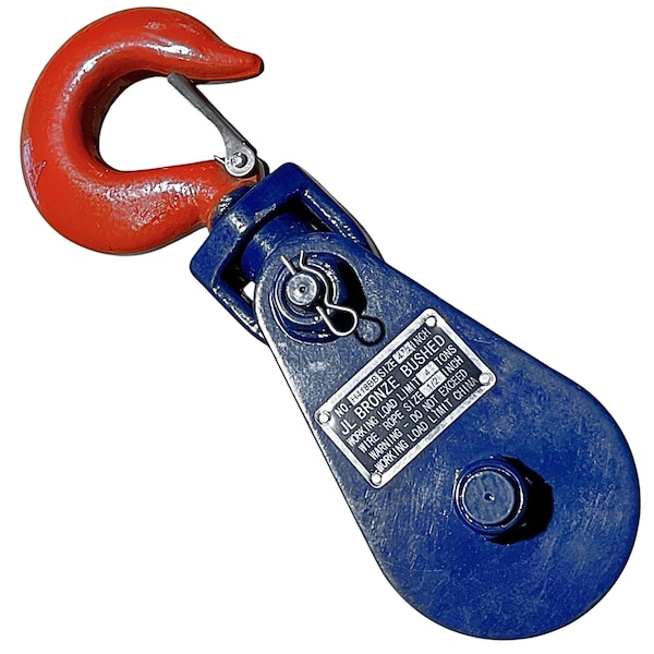 This snatch block is constructed from durable steel and designed for reliable performance in lifting and pulling applications. It features a blue body with a high-visibility red hook or shackle for quick identification on the job. The single sheave design allows smooth load redirection while reducing wear on wire rope. Available with either a swivel hook or shackle configuration, it offers flexibility for different rigging setups. Multiple diameter options provide the correct fit and capacity for a range of working conditions. Each size is rated to handle specific working load limits and compatible wire rope diameters for safe, controlled operation.