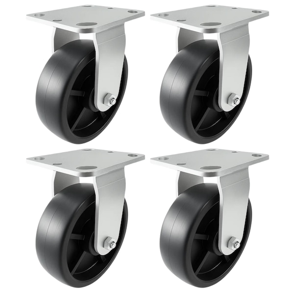 This 4-piece Heavy Duty Caster Set with black plastic wheels delivers strength, durability, and easy mobility for demanding applications. Offered in multiple set configurations-rigid, swivel, swivel with brake, or mixed combinations-these casters adapt to a wide range of equipment needs. Wheel sizes from 4in to 8in feature a 2in tread width and load capacities ranging from 600 lbs to 900 lbs per caster. The injection-molded polyolefin or polypropylene wheels are lightweight, impact-resistant, and non-marking, providing excellent floor protection while resisting chemicals, oils, solvents, and water. Cold-forged top plates, hardened raceways, and a double row ball bearing swivel raceway enhance strength and ensure smooth performance. All metal components are zinc-plated for corrosion resistance, while Zerk fittings allow easy lubrication and extended service life. Perfect for platform trucks, food service equipment, and large stock carts, these casters combine a lightweight design with heavy-duty capabilities.