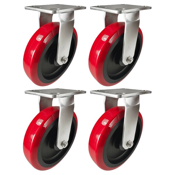 Heavy Duty Caster Set 8in Polyurethane on Plastic Wheels, 4 Rigid, 4PK