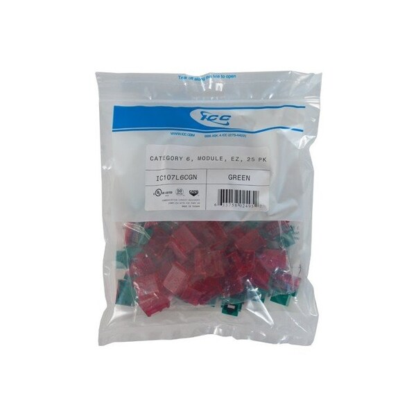 ICC Category 6 modular connectors- 25 Pack- RJ-45 keystone jacks- 8 Position 8 conductor- CAT 6 rated connectors provide excellent performance for data networks requiring maximum speed and bandwidth-PCB technology provides maximum performance and superior signal quality-Enhanced crosstalk cancellation reduces return loss and improves performance by rejecting noise and unwanted signals-Designed with in-line 110 IDC, in-sequence termination reducing termination time-Terminate with 110 punch down tool ICACSPDT00-One piece termination cap allows for quick and easy termination-Includes an integrated TIA-568A/B color wiring diagram-Backwards compatible to all lower rated category components-Compatible with all ICC configurable faceplates, inserts, surface mount boxes, and blank patch panels-Compatible with all ICC furniture faceplates, Elite bezels, and Elite bezels, and Elite surface mount boxes-Used with category 6 patch cords-UL Listed