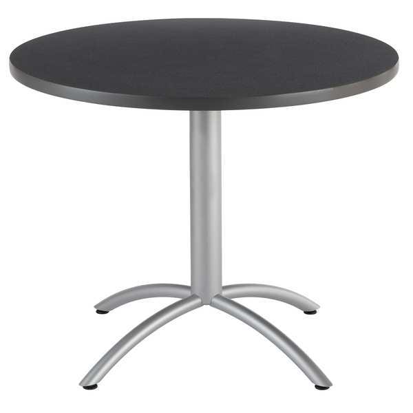 Cafe/Breakroom Table, Surface Material Laminated Melamine, Round, Diameter 36 in, Height 30 in, Tabletop Color Family Gray, Tabletop Color Graphite Granite, Frame Color Silver, Assembled/Unassembled Unassembled, Frame Material Steel, Edge Color Gray, Edge Type T-Molded, Leg Type Arched, Top Thickness 1 1/8 in, Series CafeWorks, Load Rating 250 lb, Standards Not Applicable, Includes (4) Leveling Glides