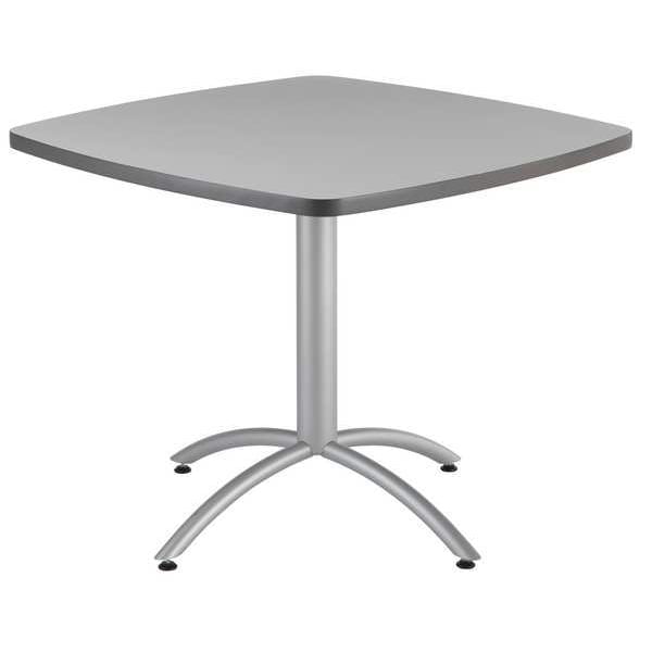 Cafe/Breakroom Table, Surface Material Laminated Melamine, Square, Width 36 in, Length 36 In., Height 30 in, Tabletop Color Family Gray, Tabletop Color Gray, Frame Color Silver, Assembled/Unassembled Unassembled, Frame Material Steel, Edge Color Gray, Edge Type T-Molded, Leg Type Arched, Top Thickness 1 1/8 in, Series CafeWorks, Load Rating 250 lb, Standards Not Applicable, Includes (4) Leveling Glides