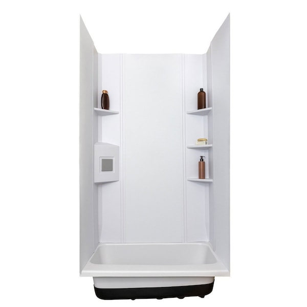 Modular surround kit intended for installation around a bathtub. Includes: 1x Shelf Corner, 1x Faucet corner, 1x 30 x 72 trimmable back panel, and 2x 15 x 72 trimmable end panels. The corners are designed with adjoining flanges to accept the trimmed panels. Panels include adhesive tape to aid in installation. The corners have a 10 installed width. The flanges are 3/4 deep, making the effective max width/depth for install 48 1/2 x 24 1/4.