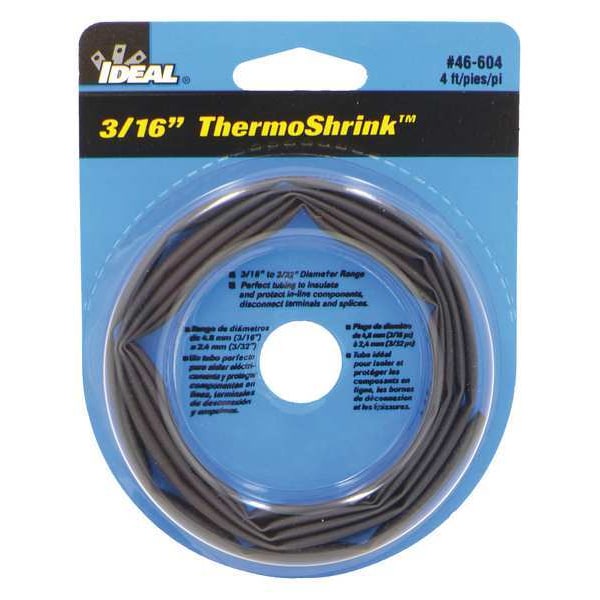 Heat Shrink Tubing, Thin Wall, Material Polyolefin, Flexible, Flame Retardant Yes, Adhesive Lined No, Shrink Ratio 2:1, Use With Wire Size 20 AWG to 14 AWG, I.D. Before Shrinking 0.21 in, I.D. After Shrinking 0.09 in, Wall Thickness After Shrinking 0.02 in, Length 4 ft, Shrink Tubing Properties UV Light-Resistant, Color Black, Temp. Range -55 Degrees to 125 Degrees F, Package Style Individual Pieces, Min. Shrink Temp. 158 Degrees F, Dielectric Strength 600 V, Max. Temp. Rating 125 Degrees F