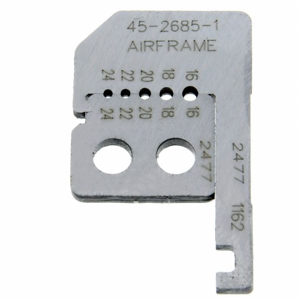 Wire Stripper Replacement Blades, Part Type Stripper Replacement Blade, Compatible with Grainger Part Number 10F590, Compatible with Manufacturer Model Number 45-2685, Compatible with Series 45 Series, Blade Material Steel, Number of Blades 1, Features Inner cutting hole, Mil-spec die-type blades, Maximum Wire/Cable Diameter 16 ga, Overall Length 1 2/5 in