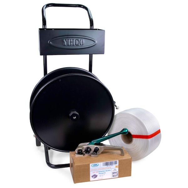 Full strapping kit with premium tools 1/2" woven cord 650 lbs Break Strength Included: 1/2" HD woven cord strapping 3900 feet, 1000 phosphate buckles, HD tensioner with cutter (MUL-325), Strapping Cart For high volume, intensive strapping