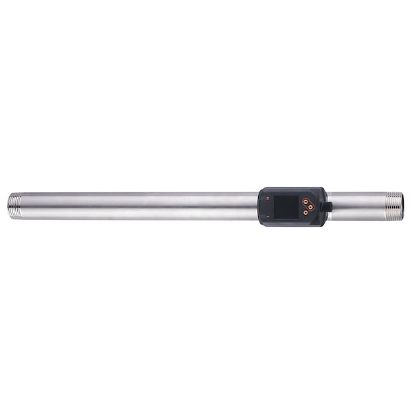 Industrial gas counter/meter. Measurement of gas flow, consumption, pressure and gas temperature for argon (Ar), carbon dioxide (CO2), nitrogen (N2) and compressed air. Digital display with bright red/green identification of the acceptable range. Two digital PNP/NPN outputs, one analog 4-20 mA analog output. IO-Link. Measuring range 14...3750 l/min. Sensor is factory mounted in 475 mm long 1" diameter pipe with male R1 threads.