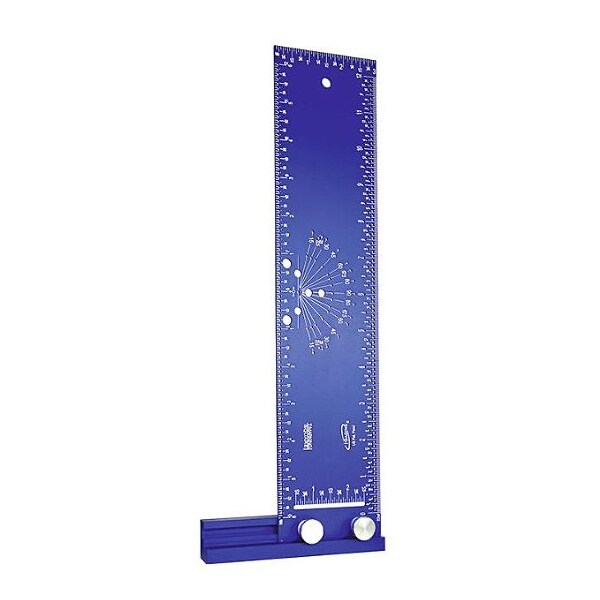 16ths scale has left to right and centering rule with small drilled holes every 1/16''. 32nds scale has left to right rule with small drilled holes every 1/16''. 3'' scale on top, 2'' rule at the bottom from 1/2'' to 2 1/2''. Angle markings and drilled holes in the center from 0 degree - 90 degree - 0 degree in 15 degree increments plus a 22.5 degree, 25 degree and 67.5 degree. Accuracy: +-0.002''. 5'' L x 1'' H sliding base with 1'' scale markings on rear side. 2 mm solid aluminum frame with a protective anodized finish. Precision laser engraving. Two removable metal locking screws. Supplied in protective case.