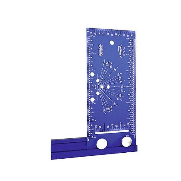 16ths scale has left to right and centering rule with small drilled holes every 1/16''. 32nds scale has left to right rule with small drilled holes every 1/16''. 3'' scale on top, 2'' rule at the bottom from 1/2'' to 2 1/2''. Angle markings and drilled holes in the center from 0 degree - 90 degree - 0 degree in 15 degree increments plus a 22.5 degree, 25 degree and 67.5 degree. Accuracy: +-0.002''. 5'' L x 1'' H sliding base with 1'' scale markings on rear side. 2 mm solid aluminum frame with a protective anodized finish. Precision laser engraving. Two removable metal locking screws. Supplied in protective case.
