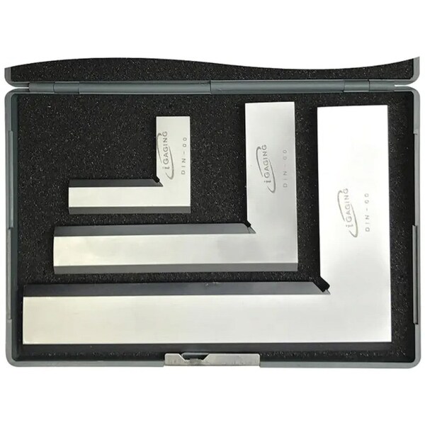 Beveled blades on both edges of each side. Accuracy meets DIN 00 Specifications. Made from a single piece of hardened steel. Accurate right angles for both inside and outside. Precision lapping for straightness and parallelism. Supplied in protective case. 2'' & 4'' Blade Length Accuracy Parallel: 0.0008'', Accuracy Square: 0.0012''. 6'' Blade Length Accuracy Parallel: 0.0012'', Accuracy Square: 0.0016''.