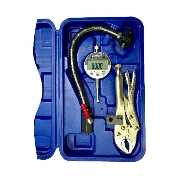 Attaches To Any Convenient Object. Wear and runout gauge set comes in a convenient molded case. Checks tire and wheel runout, gear backlash, valve guide wear, etc. 12" flex arm can be set to almost any measuring position desired. This tool is useful where you can not use magnetic base. Will attach to any object. Vise Lockable Pliers Flexible Shaft. 1" Electronic Indicator w/ 3 Reading functions: inch, metric, & fractional. Range: 0-1". Accuracy: +/- 0.001". Resolution: .0005" / .01mm / 1/128 inch. Molded storage case included.