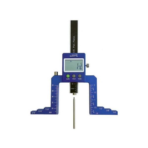 iP54 protective rating: Moisture and dust resistance. Measuring Range: 0 - 2''/50 mm. Resolution: 0.0005'', 0.01 mm, 1/64''. Accuracy: 0.001''/0.03 mm. Large LCD display. Decimal inch/metric/fraction conversion. 16th and 1 mm scales, 3/16'', 1/4'', 5/16'', 3/8'', 7/16'' and 1/2'' steps. Includes three interchangeable anvils: 1/4'' and 1/2'' dia. center to fence check and 2'' depth extension rod. Hold button. Stainless steel beam. Aluminum body with blue anodized finish. Laser engraving markings. Auto shut-off after 5 minutes. Battery: 3V CR2032 included. Supplied in protective case.