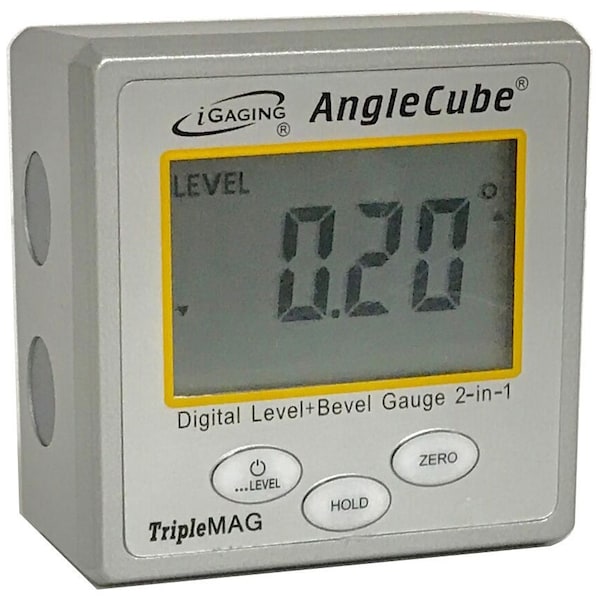 Get precise angle readings. Large LCD display reads upright at any angle. Digital angle gauge/inclinometer is great for precise angle measurements. With the magnetic base, it's easy to assist in measuring metal objects. Super large reversible LCD display. CNC machined aluminum body. U.S. made Navigational sensor for tracing sea level. Measure relative bevel. Embedded strong magnets on three sides. Measure range: 360 degrees (4 x 90). Resolution: 0.05 degrees. Accuracy: +/- 0.2o. Standard 9V battery (250hrs). Tangent tilt rate %, shows tilt in %.