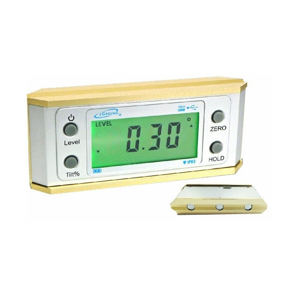 IP65 Water & Dust Resistance. Military Grade Alloy Surfaces. Allow Contracted Body. V Groove Surfaces. Strong Magnetic Base. Digital Level Sensor. Anodized Finish. Precision Lapping. Micro USB Charging. Data Output (optional). Tilt range: 0°-90° x 4. Resolution: 0.05". Accuracy: 0.2°. Repeatability: 0.1°. Battery: rechargeable. Size: 6" x 2.4" x 1/2". Weight 8.5 oz.