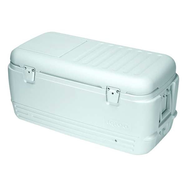 Chest Cooler, Chest Cooler, With Wheels No, 100 qt, Exterior Length 35 1/4 in, Exterior Width 17 3/8 in, Exterior Height 16 3/4 in, Plastic, Ice Retention Up to 2 days, Body Color White, Lid Color White, Number of Cans 145