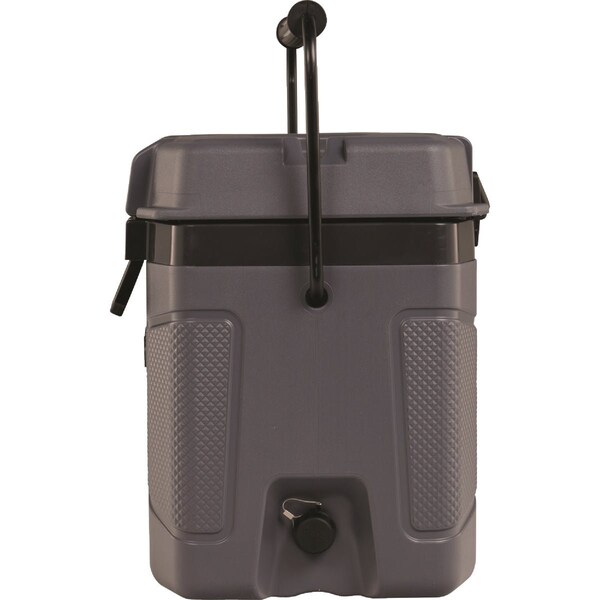 Heavy-duty blow-molded construction cooler. Features a lockable lid with leak-resistant gasket dual sized self draining cupholders and is fully insulated with a 1.5-inch foam wall throughout. Also includes two finger Sure-Lock latch oversized hinges 3-piece with Stay-Open detent. Extra wide comfort grip bail handle. Bottle opener/locking plate. Cool Riser technology elevated design improves cooling performance. Threaded drain plug is garden hose compatible and features a non-slip easy-grip tethered cap.