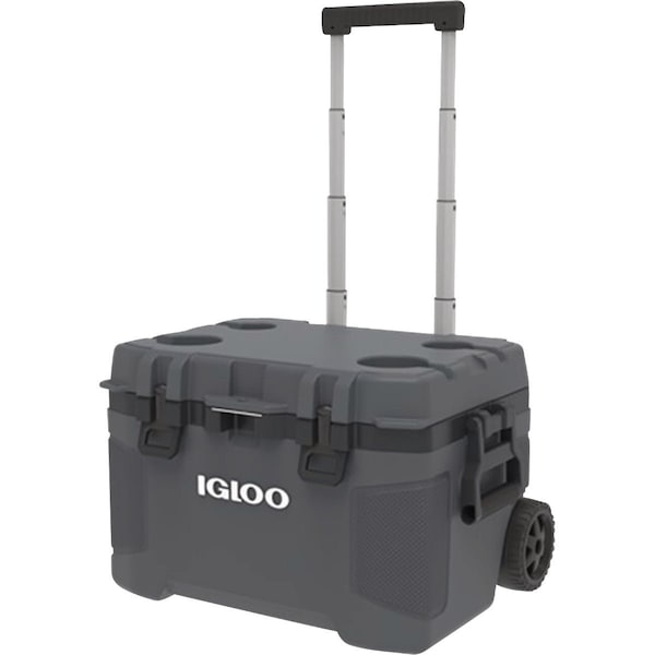 Heavy-duty blow-molded construction cooler. Features a lockable lid with leak-resistant gasket dual sized self draining cupholders and is fully insulated with a 1.5-inch foam wall throughout. Also includes two finger Sure-Lock latch oversized hinges 3-piece with Stay-Open detent. Extra wide comfort grip bail handle. Bottle opener/locking plate. Cool Riser technology elevated design improves cooling performance. Threaded drain plug is garden hose compatible and features a non-slip easy-grip tethered cap. Marine grade aluminum telescoping handle. 6-inch soft ride wheels.