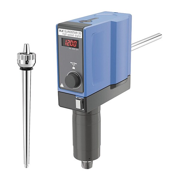 Overhead Mixer, Volume 20 L, Max. Viscosity 10,000 cps, Maximum Torque 20 N-cm, Operating Speed 150 to 6000 rpm, Mixing Speed Type Variable, Voltage 115V, Overall Height 12 13/16 in, Overall Length 8 3/16 in, Overall Width 3 13/32 in, Shaft Dia. 16 mm