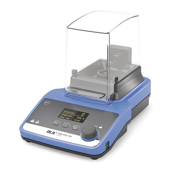 Tube Mill 100 Control, Volume 100mL, Max. Grain Size 10 mm, Max. Grain Hardness 5 Mohs, Max. Speed 25,000 RPM, Height 8.3 in, Width 7.1 in, Depth 11.8 in, Weight 6.1 lb, Voltage 100/120V AC, Features Adjustable Safety Speed, Adjustable Safety Time, Multilingual OLED Display, Programmable and Storable Test Conditions, Reproducible Test Results, Timer Adjustable from 5 Sec to 3 Min, Touch Keypad, USB Interface, Includes Grinding Chambers