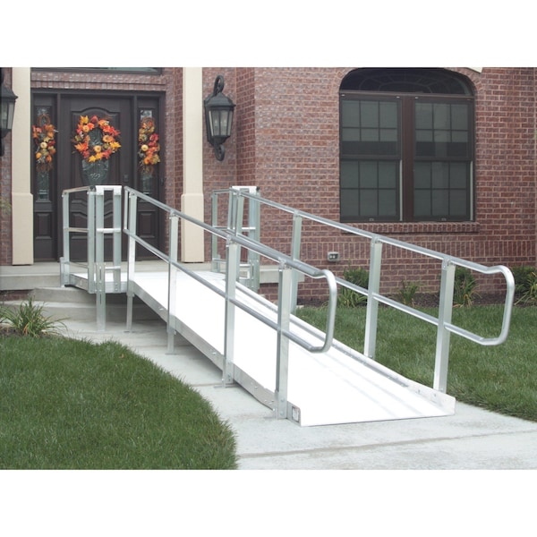The MXP18.0 Modular XP Ramp System from Prairie View Industries is a comprehensive wheelchair accessibility solution featuring all-aluminum construction for durability and low maintenance. This 36-inch usable width by 18-foot length ramp system combines welded modular sections in 3-foot and 4-foot lengths, allowing for custom configurations that can be easily moved or reconfigured to meet changing facility requirements. The slip-resistant grooved aluminum floor surface provides reliable traction in wet or dry conditions, while the weather-resistant aluminum frame requires minimal site preparation and upkeep. This system incorporates ADA-compliant safety features including 4-inch curb edge protection and double 1.5-inch handrails adjustable between 34 and 38 inches in height. The ramp accommodates various accessibility challenges with 45 and 60-degree platform options designed for hard-to-reach areas. Optional accessories include ADA handrail extensions, stairs, and gate systems, with custom width configurations available in 42 and 48 inches. This ramp system is ideal for commercial facilities, healthcare centers, municipal buildings, and any environment requiring reliable, code-compliant wheelchair access. The modular design ensures flexibility for both temporary and permanent installations while maintaining professional-grade construction standards suitable for high-traffic commercial applications.