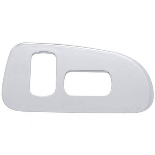 This chrome window switch trim with two openings for the 223 Peterbilt 389 adds a clean, polished finish to the interior door panel. Designed as a direct replacement, it provides a precise fit around the window switches for a sharp, upgraded look.