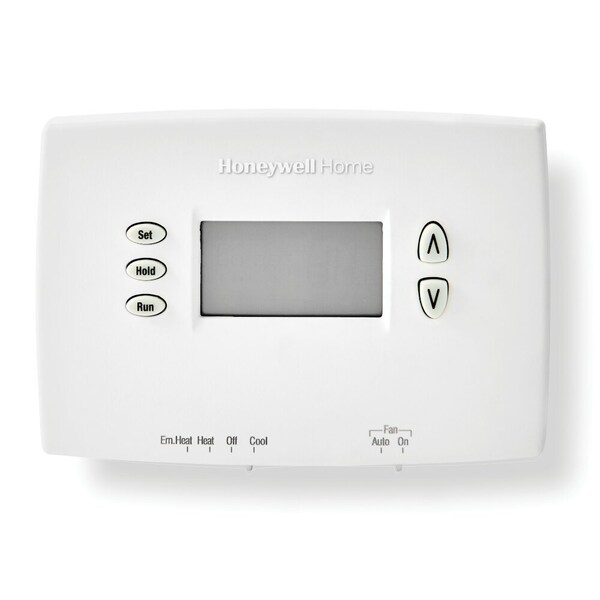 Resideo PRO 2000 Horizontal Programmable Thermostat designed for commercial and residential HVAC applications requiring flexible temperature control. This unit is compatible with both heat pump and conventional heating and cooling systems, supporting up to 2 heat and 1 cool stages for optimized climate management. The 5-2 day programmable schedule allows separate weekday and weekend settings, enabling energy-efficient operation across varying occupancy patterns. Featuring a backlit LCD display with real-time clock and English-language interface, the thermostat provides clear visibility and intuitive operation in any lighting condition. Dimensions of 3.44 inches in height by 4.63 inches in width and 1.19 inches in depth allow for compact installation in standard wall spaces. The unit operates on dual power, accepting hardwired 24 VAC input (20-30 V nominal range) while maintaining battery backup capability for continued operation during power interruptions. Temperature setpoints adjust from 40 Degrees F to 99 Degrees F, accommodating diverse climate control requirements. Horizontal mounting orientation facilitates easy installation and readability. This replacement thermostat is ideal for facilities requiring dependable, programmable temperature management with minimal maintenance. Compatible with Resideo systems and comparable HVAC equipment. Batteries included for immediate operation.