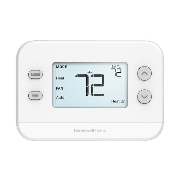 The Resideo TH1110U4000 (Honeywell FocusPRO N100) is a non-programmable digital thermostat engineered for straightforward temperature control in commercial and residential HVAC applications. This single-stage 1 heat/1 cool unit delivers reliable performance across conventional systems, heat pumps, and diverse heating methods including gas, oil, electric, steam/radiant, and forced air configurations without auxiliary heat capability. Powered by 20-30 VAC at 50/60 Hz, this thermostat offers flexible installation options with optional 2 AA alkaline battery backup or hardwired C-wire functionality for continuous backlit display operation. The large 4.09 square inch LCD display provides clear, easy-to-read temperature information with dual Degrees F/ Degrees C capability, ensuring quick operator recognition in any facility. Precision temperature management is assured with +/-1 Degrees F accuracy and a differential rating of +/-0.5 Degrees C, meeting industrial standards for consistent climate control. The setpoint range accommodates diverse applications: heating adjusts from 32 to 90 Degrees F (0-32 Degrees C), while cooling ranges from 50 to 99 Degrees F (10-37 Degrees C). The low heat limit is configurable to 32 Degrees F for specialized applications such as garage installations or freeze protection scenarios. Ideal for facilities requiring dependable, non-programmable temperature regulation without complex scheduling features, this thermostat suits maintenance departments, smaller commercial spaces, and applications demanding straightforward operation. Its universal compatibility across multiple fuel types and system configurations makes it a versatile choice for facility managers and HVAC professionals seeking cost-effective temperature control solutions.