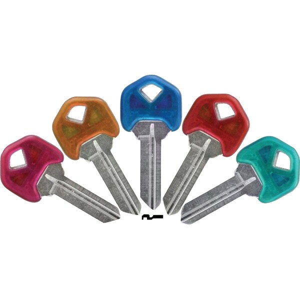 Nickel-plated key blank with plastic-coated head. When you order one you will receive 5 keys with assorted colors. Brass construction.