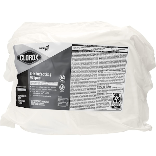 CloroxPro Clorox Disinfecting Wipes Fresh Scent 700 count are EPA registered to kill 99.9 percent of germs on hard, non-porous surfaces including bacteria, cold and flu viruses, MRSA, Staph, E. coli, Strep, Salmonella, and the organism causing whooping cough. Available in a pack of 2, these wipes sanitize surfaces in 10 seconds, three times faster than before. These wipes also meet EPA criteria for use against SARS-CoV-2. They remove allergens such as pet dander, pollen, and grass, and are suitable for cleaning doorknobs, handrails, faucets, phones, keyboards, and mice in various environments.