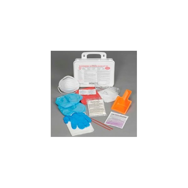 IMPACT® 7351 BLOODBORNE PATHOGEN CLEAN KIT COMPLIES WITH OSHA STANDARD 29 CFR 1910.1030 FOR CLEANING BLOOD. HEAVY-DUTY PLASTIC CASE WITH SAFETY LATCH AND HANDLE; CAN BE WALL MOUNTED. INCLUDES ONE PAIR DISPOSABLE VINYL GLOVES, ONE PAIR DISPOSABLE SHOE COVERS, ONE DISPOSABLE APRON, TWO SCOOP/SCRAPERS, TWO RED BIOHAZARD BAGS WITH TIES, ONE DISPOSABLE TOWEL, ONE PAIR PROTECTIVE EYEWEAR, ONE ISOLATION MASK, ONE 3-OZ. PACKET OF ABSORBENT POWDER, TWO ANTISEPTIC WIPES, ONE DISPOSABLE WIPE WITH HIV-1 TUBERCULOCIDAL CLAIM, MATERIAL SAFETY DATA SHEETS AND INSTRUCTIONS.