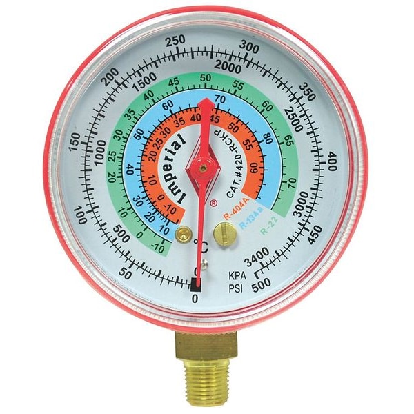 High Side Gauge, Diameter 2 1/2 in, Working Pressure 0 to 500 psi, Connection Size 1/8 in, Color Red, Gauge Type High Side Gauge, Gauge Accuracy +/-3-2-3 Percent, For Use With R-134A, R-22, R-404A, Application Replacement Manifold Gauge for Manifold Gauge Sets